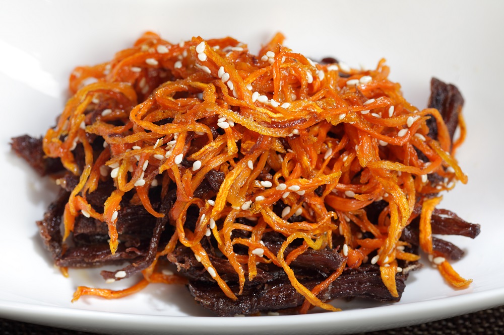 Затем почистите и нарежьте тонкой соломкой морковь. Растворите сахар в 50 мл воды, добавьте получившийся сироп в морковь, перемешайте. Обжарьте морковь во фритюре на остром масле до золотистого цвета. В глубокую тарелку выложите говядину. Морковь перемешайте с кунжутом, выложите сверху на говядину.