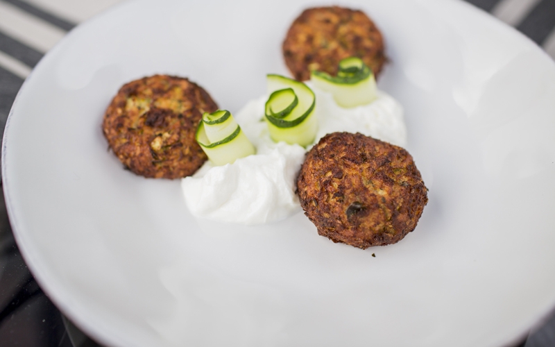 Ингредиенты: 1 кг цукини (или молодых кабачков), по 50 г рубленой петрушки и укропа, 1 зубчик чеснока, 1 луковица, 200 г феты, 1 яйцо, 5 г орегано, перец и соль по вкусу, 100 г сухарей панировочных.