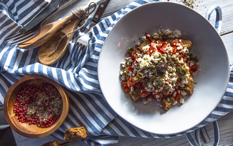 Чтобы ощутить своеобразие греческой кухни, нужно непременно попробовать критский салат дакос из овощей, сыра и размоченных сухарей, а также салаты-пасты. Прежде всего, это, дзадзики — из йогурта, огурцов и чеснока. Дзадзики используют в качестве соуса к овощным, мясным блюдам и жареной рыбе. Популярны и мелидзана, приготовленная из запеченных баклажан, и тарамасалата — из рыбной икры и отварного картофеля.