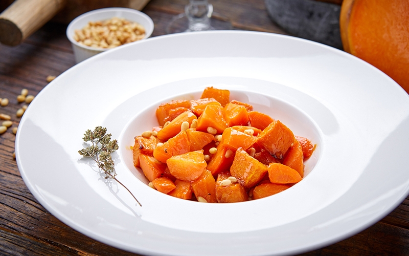 Инструкция. Предварительно отварите морковь и нарежьте кубиками. Порежьте тыкву кубиками (примерно 2х2 см), выложите все на пергамент и полейте медом. Выдавите чеснок через давилку, добавьте тимьян и посыпьте морской солью. Запеките в духовке до готовности и обжарьте с апельсиновым бальзамиком, полейте оливковым маслом и посыпьте обжаренными кедровыми орехами.
