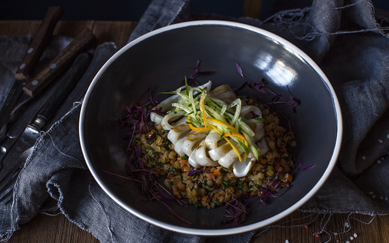 Инструкция. Замочите чечевицу на 3 часа, слейте лишнюю воду, обжарьте на оливковом масле в течение 2-х минут. Нарежьте мелким кубиком все овощи и обжарьте на оливковом масле в течение 5 минут. Приготовьте маринад и маринуйте кальмара в течение 30 минут. Затем обжарьте на гриле с двух сторон по 3 минуты.