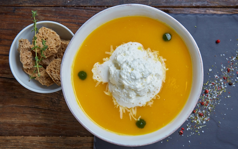 Ингредиенты: 1200 г тыквы, 80 г лука-порея, 400 г картофеля, 200 г лука репчатого, 400 г моркови, соль, перец, сахар — по вкусу. Немного листьев шпината для украшения. Небольшое количество критских ячменных сухарей для подачи.