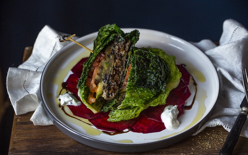 Бургер Арни (бургер с котлетой из баранины, соусом дзадзики и овощами гриль в савойской капусте)
