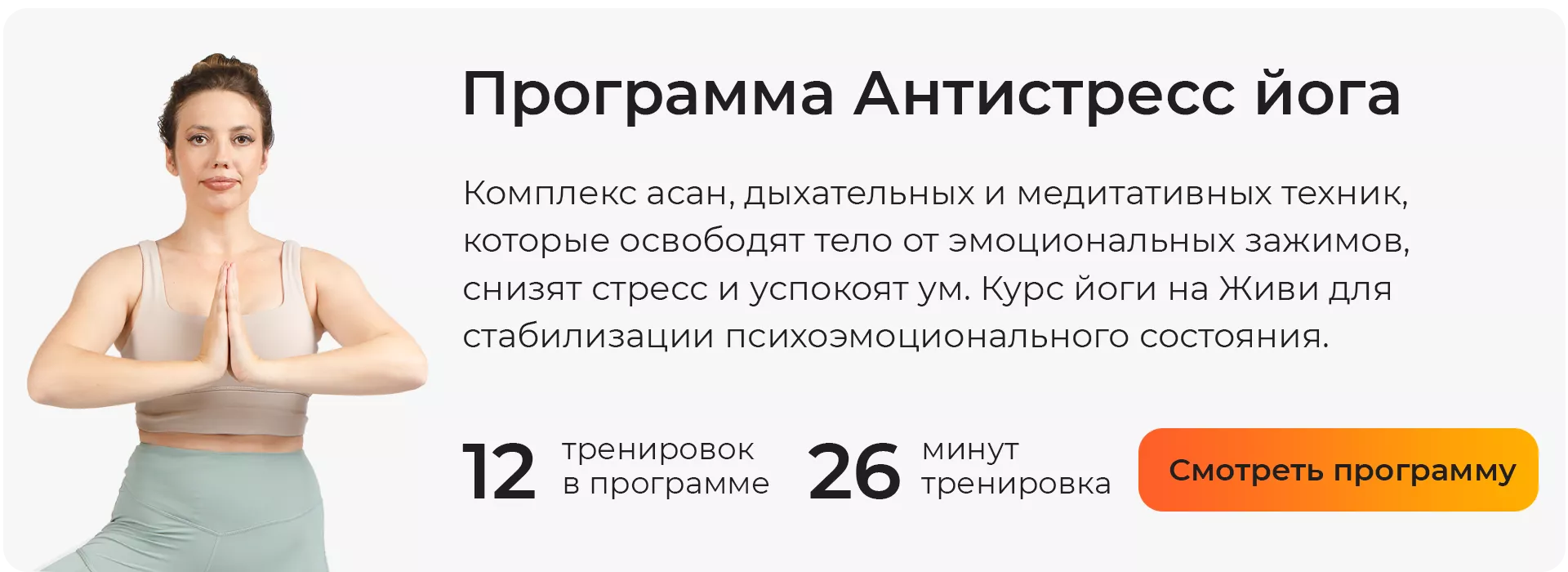 Занимайтесь по этой программе ежедневно — комплекс имеет накопительный антистресс-эффект. Чем регулярнее будете тренироваться, тем быстрее сможете достигать расслабленного состояния.