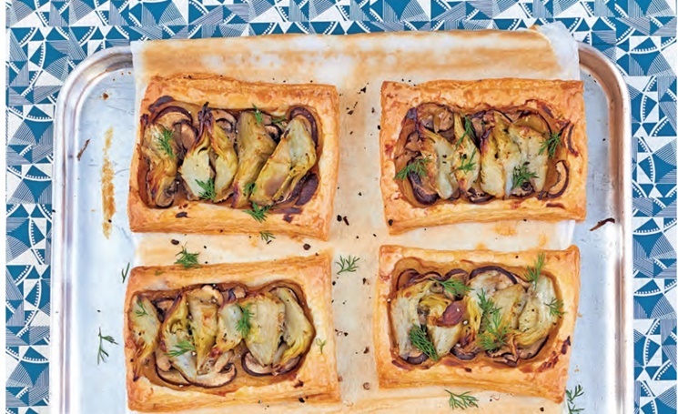 Ингредиенты: 320 г (1 пласт) веганского слоеного теста, 2 ч.л. горчицы, 200 г шампиньонов, 1 банка (240 г) консервированных артишоков, сок одного лимона, несколько веточек свежего укропа, соль по вкусу.