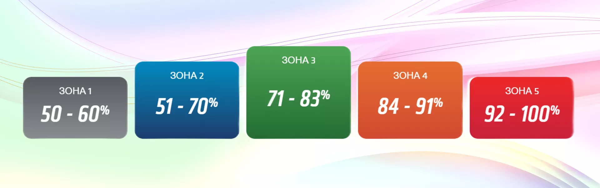 - Зона 5 — красная — 92% и выше — экстремальная или максимальная, развитие взрывной силы и скорости.