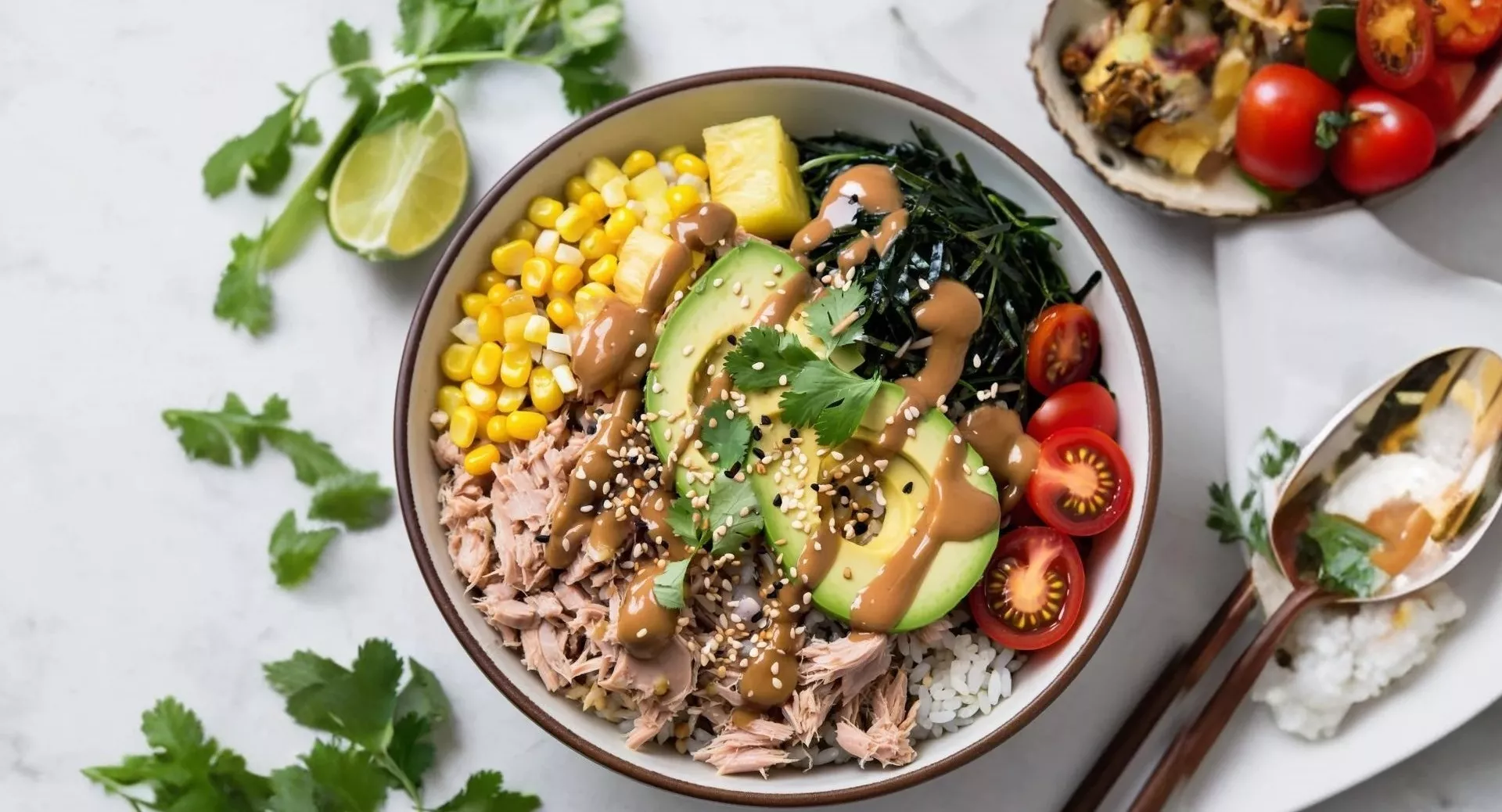 Инструкция. Авокадо нарежьте кубиками, ананас — на небольшие кусочки, черри — на половинки. На отваренный рис выложите начинку: кусочки тунца, салат из морских водорослей, авокадо, ананас, черри. Сверху покрошите зелень, полейте соусом и посыпьте кунжутом.