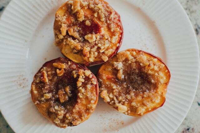 Ингредиенты: 2 абрикоса или персика (разрезанные пополам и без косточек), 2 чашки натурального греческого йогурта, 4 ст. л. измельченных поджаренных грецких орехов, 4 ст. л. кленового сиропа (или меда, или сиропа агавы).