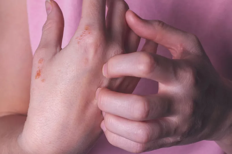 Экзема – воспалительное заболевание кожи и наиболее распространенная причина возникновения красных пятен на руках. Часто заболевание бывает хроническим – сопровождается периодическими рецидивами. «При экземе пятна могут быть с четкими и нечеткими границами, – комментирует Александр Чижов, врач-дерматолог, основатель школы здоровой кожи для людей с атопическим дерматитом. – Они могут выглядеть как простые покраснения или сопровождаться типичными для этого заболеваниям пузырьками с прозрачной жидкостью, корками и шелушением. Среди других симптомов – выраженный зуд».